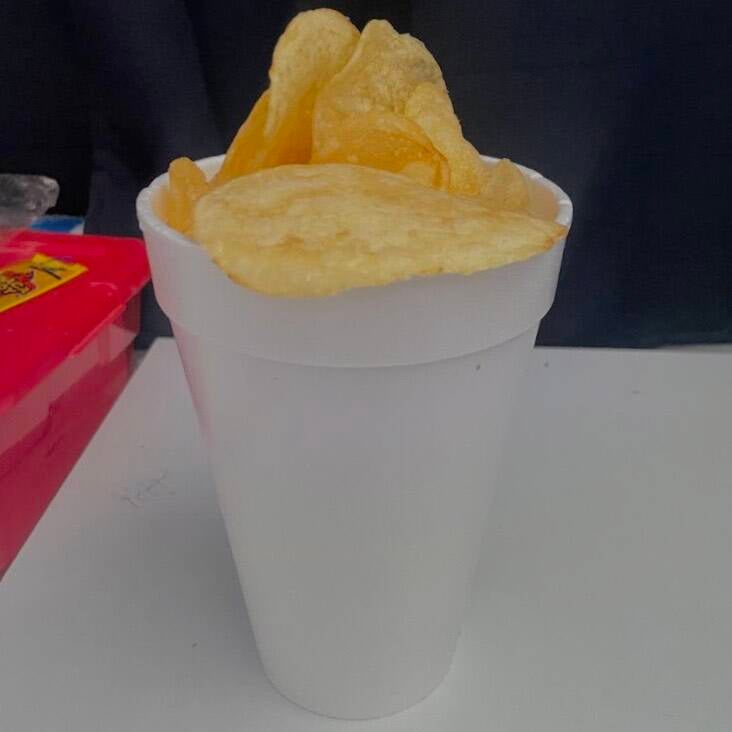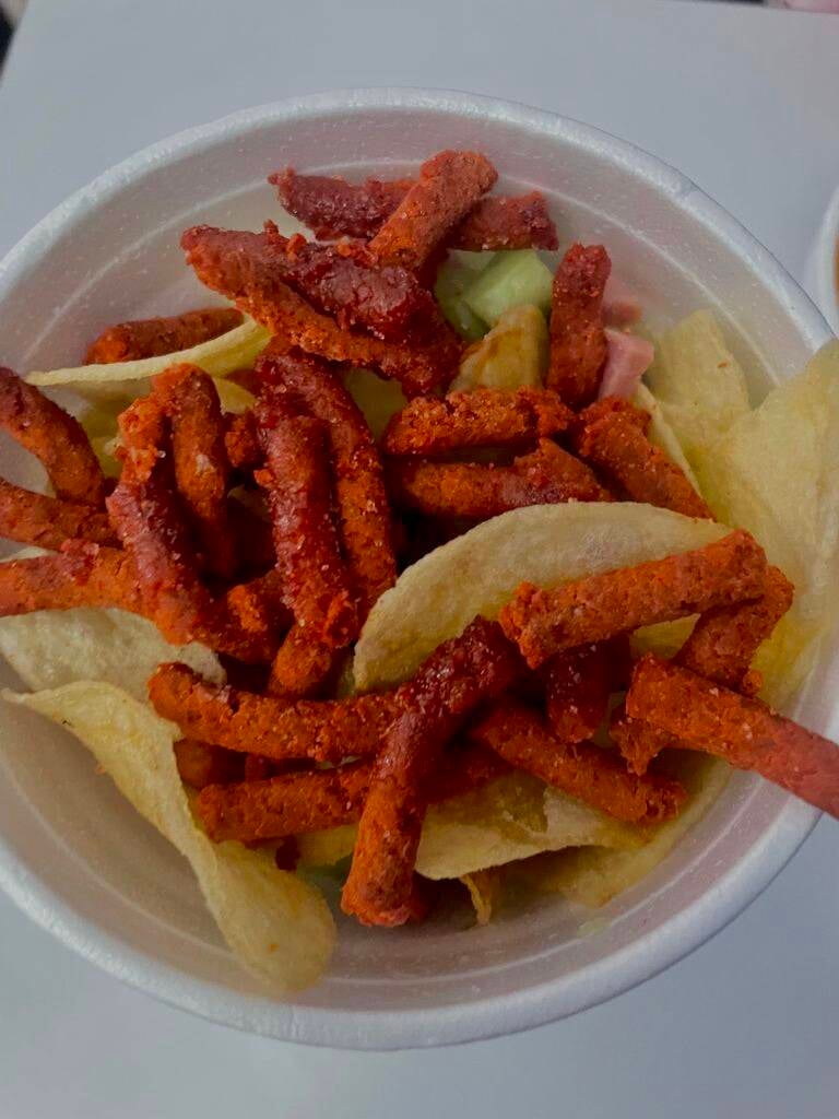 Vaso de 1L con dos tipos de papitas (al gusto del cliente), preparado con fruta, verdura y salsas.